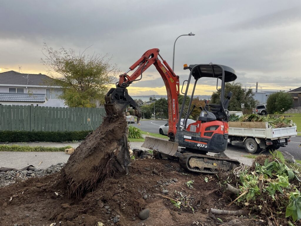 Bucklands Beach – Grab bucket used to remove garden area including stumps ready for new flat area for slidding gate to be installed.